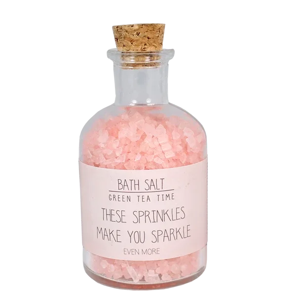 Natuurlijk badzout in een leuk glazen flesje. Met dit badzout kan je heerlijk ontspannen met de geur Green Tea Time Steek er een kaarsje bij aan, zet een muziekje op en you are all set voor jouw relax moment.
